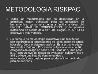 RiskPAC es una metodología automatizada para el análisis de riesgos que puede detectar vulnerabilidades en la seguridad de datos. Se basa en un enfoque cualitativo con tres niveles de evaluación - Entorno, Procesador y Aplicaciones - y 26 categorías de riesgo por nivel. Ofrece una evaluación subjetiva del riesgo y recomendaciones de contramedidas para ayudar en el informe final.