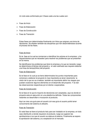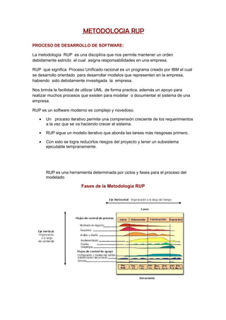 La metodología RUP (Rational Unified Process) es un proceso iterativo para el desarrollo de software que sigue cuatro fases principales (Inicio, Elaboración, Construcción y Transición) y produce artefactos clave en cada fase. RUP enfatiza el modelado visual, los requisitos, la arquitectura basada en componentes y el control de cambios.