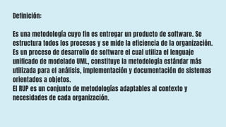 El RUP (Proceso Unificado de Rational) es una metodología para el desarrollo de software orientado a objetos que utiliza UML. Se caracteriza por ser iterativo e incremental, centrado en la arquitectura y guiado por casos de uso. Consta de cuatro fases secuenciales (inicio, elaboración, construcción y transición) que concluyen con productos intermedios. Ofrece ventajas como evaluar riesgos tempranamente y facilitar la reutilización de código.