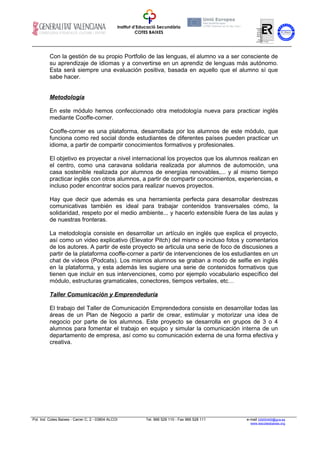 Este documento describe un taller de comunicación emprendedora que forma parte de un curso de gestión de ventas y espacios comerciales. El taller tiene como objetivos mejorar el aprendizaje de idiomas, facilitar la movilidad en Europa y ayudar a las empresas internacionales. Los estudiantes utilizan una herramienta llamada Portfolio Europeo de Lenguas para evaluar y mejorar sus habilidades lingüísticas. Ellos también desarrollan una plataforma llamada Cooffe-corner para practicar inglés y compartir proyectos con estudiantes