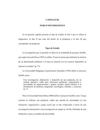 Este documento presenta el marco metodológico de un proyecto que busca desarrollar una propuesta estratégica para el uso de TIC con fines educativos en la Universidad Portuguesa. El estudio utilizará un diseño de proyecto factible y campo. La población son 47 profesores y la muestra 14. Se aplicará una encuesta validada por expertos para diagnosticar el uso actual de TIC. Luego se diseñará una propuesta, la cual será evaluada por directivos, expertos y académicos para determinar su viabilidad. El an