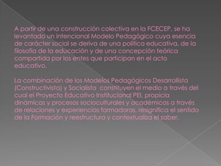 El modelo pedagógico de la FCECEP se basa en los enfoques desarrollista (constructivista) y socialista. Combina estos enfoques para promover procesos socioculturales y académicos a través de relaciones y experiencias que resignifican la formación. Se fundamenta en teorías como el aprendizaje significativo y busca que los estudiantes construyan conocimiento de manera activa y contextualizada. La evaluación es continua, cualitativa y busca valorar procesos más que resultados.