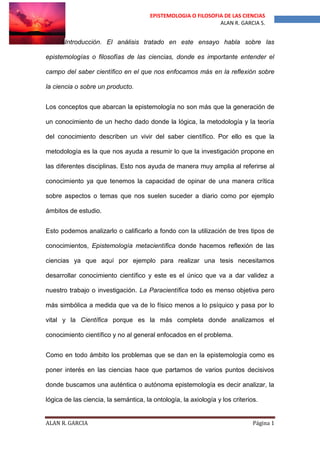 El documento habla sobre la epistemología o filosofía de las ciencias. Explica que la epistemología se enfoca en la reflexión sobre la ciencia y la generación de conocimiento a través de la lógica, la metodología y la teoría del conocimiento. También describe tres tipos de conocimiento: la epistemología metacientífica, la paracientífica, y la científica. Finalmente, señala que la epistemología analiza aspectos como la lógica, la semántica, la ontología, la axi