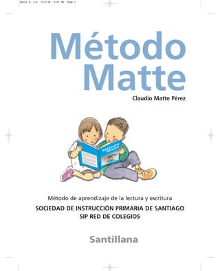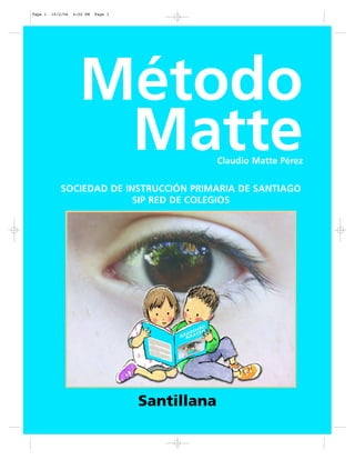Este documento presenta el método fonético-analítico-sintético de aprendizaje de la lectura y escritura desarrollado por Claudio Matte. El método se divide en tres partes: la primera enseña los sonidos de las letras a través de 29 lecciones, la segunda las letras mayúsculas y combinaciones en 24 lecciones, y la tercera presenta textos para la lectura expresiva en 28 cuentos y poesías. El método busca un aprendizaje gradual y entretenido de la lectoescritura al mismo tiempo que el desarrol