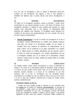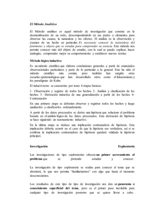 El documento describe varios métodos de investigación como el método analítico, inductivo, descriptivo, experimental, explicativo, correlacional, histórico-lógico. Cada método se caracteriza por tener un enfoque particular como descomponer un todo en partes, derivar conclusiones generales a partir de observaciones, describir características de una situación, manipular variables para establecer relaciones de causa-efecto, determinar orígenes y causas de fenómenos, analizar correlaciones entre variables, e investigar leyes generales considerando el desarrollo histó
