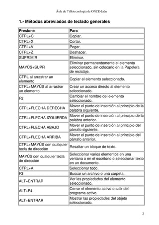 Este documento proporciona una lista de atajos de teclado útiles en Windows XP. Incluye atajos generales como copiar y pegar, así como atajos específicos para el Explorador de Windows y programas de accesibilidad. También explica cómo asignar atajos personalizados a programas específicos.