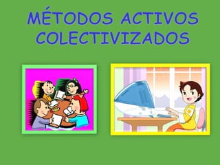 El documento describe varios métodos activos individualizados y colectivizados para la enseñanza, incluyendo el método socrático, hoja de instrucción, grupo de estudio, trabajo en equipo, Winnetka, Dalton y descubrimiento. Explica las características, principios, aplicaciones y técnicas de cada método con el objetivo de facilitar el aprendizaje autónomo y colaborativo.