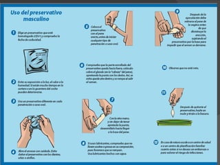 Este documento describe varios métodos anticonceptivos de barrera como el preservativo masculino, el preservativo femenino y el diafragma. Explica cómo funcionan creando una barrera física que impide el paso de los espermatozoides, y también menciona el uso de espermicidas que destruyen los espermatozoides. Proporciona detalles sobre la efectividad, ventajas, desventajas y modo de uso de cada método.