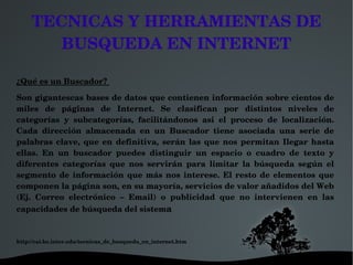 Este documento describe diferentes métodos y herramientas para realizar búsquedas en Internet. Explica qué son los buscadores, cómo funcionan y cómo realizar búsquedas básicas. También proporciona consejos para ajustar los resultados de la búsqueda, como el uso de comillas, mayúsculas y minúsculas. Además, menciona nuevos tipos de buscadores y enlaces a listas de buscadores de imágenes, videos y audio.