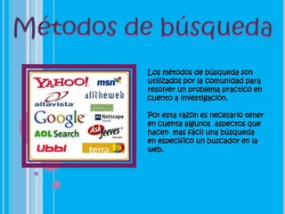Este documento describe los diferentes tipos de motores de búsqueda como índices temáticos, motores de búsqueda, y meta buscadores. Explica operadores de búsqueda como AND, OR, y NOT para especificar y ampliar una búsqueda. También cubre el uso de comillas para buscar frases exactas. Finalmente, incluye bibliografías relacionadas a métodos de búsqueda.