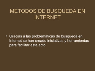 El documento describe diferentes métodos de búsqueda en Internet, incluyendo índices temáticos que organizan información por temas específicos, motores de búsqueda que usan palabras clave para indexar páginas web, y metabuscadores que combinan resultados de otros motores de búsqueda. También menciona métodos de búsqueda lineal que devuelven la posición de datos buscados pasados como parámetros.