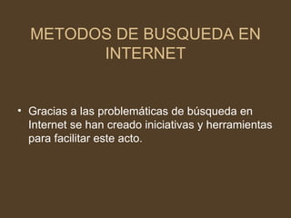 Este documento describe diferentes métodos de búsqueda en Internet como índices temáticos, motores de búsqueda, metabuscadores y búsqueda lineal o secuencial. También menciona que gracias a las problemáticas de búsqueda en Internet se han creado herramientas para facilitar esta tarea y que los motores de búsqueda usan "robots" para visitar páginas y crear bases de datos con palabras clave.