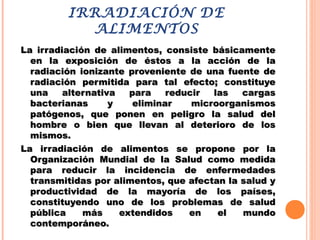 El documento describe diferentes métodos de conservación de alimentos, enfocándose en la irradiación y liofilización de alimentos. Explica que la irradiación consiste en exponer los alimentos a radiación ionizante para reducir bacterias y patógenos sin afectar el sabor o nutrición. La liofilización involucra congelar y luego sublimar el agua de los alimentos bajo vacío para preservar la estructura celular y permitir una rápida rehidratación. Ambos métodos pueden extender significativamente la vida útil