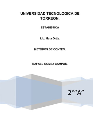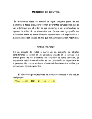 El documento presenta diferentes métodos de conteo como permutaciones, combinaciones y ordenaciones. Explica que las permutaciones consideran el orden de los elementos, mientras que las combinaciones no. Proporciona fórmulas para calcular el número de permutaciones, combinaciones y ordenaciones para diferentes escenarios, como elementos repetidos o no repetidos. También introduce diagramas de árbol como una herramienta para determinar todos los posibles resultados de un experimento aleatorio.