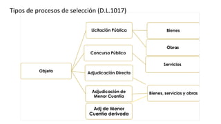 El documento presenta una charla informativa sobre los métodos de contratación según la Ley de Contrataciones del Estado 30225 y el Decreto Legislativo 1017. Explica los tipos de procesos de selección, los montos aplicables, los procedimientos de licitación pública, concurso público y adjudicación, y introduce nuevos métodos como la comparación de precios y selección de consultores individuales. Finalmente, resume las etapas clave de los procesos de contratación.