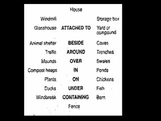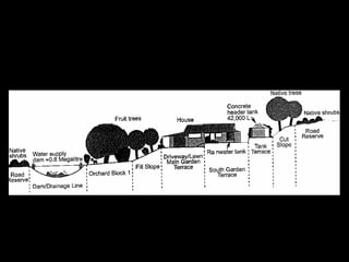 Este documento presenta varios métodos y técnicas de diseño de permacultura. Define el diseño como un proceso cultural para crear sistemas que funcionen de manera beneficiosa. Explica conceptos como análisis de zonas, sectores, sucesión y evolución para diseñar sistemas que imiten a la naturaleza y requieran poco trabajo. Resalta la importancia de observar el sitio, planificar la evolución del diseño en etapas y establecer sistemas críticos como agua y refugio desde el