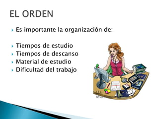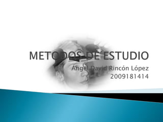 Este documento describe los métodos de estudio efectivos. Explica que es importante organizar el tiempo de estudio, descanso y material. Luego detalla 7 pasos clave para aprender: pre-lectura, notas al margen, lectura comprensiva, subrayado, esquema, resumen y memorización. Finalmente, discute condiciones como el lugar de estudio y dedicar suficiente tiempo, así como mantener una buena salud física para estudiar de manera óptima.