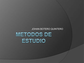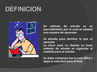 Este documento describe los métodos de estudio, incluyendo la definición, pasos clave y técnicas recomendadas. Explica que un método de estudio efectivo implica organizar el material de una manera que permita al estudiante procesar y comprender la información en lugar de ser un receptor pasivo. Recomienda siete pasos como pre-lectura, notas al margen, lectura comprensiva, subrayado, esquema, resumen y memorización. También destaca la importancia de crear un horario y plan de estudios, así como tener en