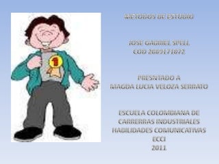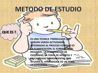 Este documento describe diferentes métodos de estudio. Explica que un método de estudio es una técnica que agrupa actividades como la planificación, el subrayado y la toma de notas para ayudar al aprendizaje de un tema. Menciona que los métodos de estudio mejoran la habilidad de una persona para estudiar y aprobar exámenes. Además, enumera algunos tipos de métodos como la memorización, el aprendizaje mecánico y los métodos basados en la comprensión y condensación de la información. Finalmente