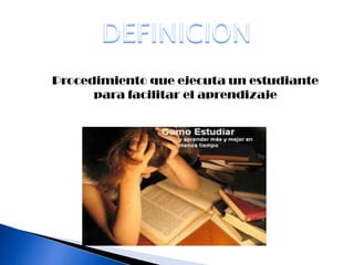 Este documento describe diferentes métodos y técnicas de estudio. Explica que los métodos de estudio son procedimientos que los estudiantes usan para facilitar el aprendizaje. Luego describe dos tipos principales de métodos: el método lógico, que crea una mente ordenada a través de procesos como el análisis y la deducción, y el método didáctico, que activa la mente mediante técnicas adaptadas a cada estudiante. Finalmente, detalla algunas técnicas comunes de estudio como el subrayado,