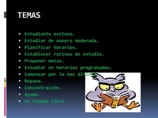 Este documento presenta varios métodos de estudio efectivos para los estudiantes. Recomienda estudiar de manera moderada tomando descansos breves, planificar horarios de estudio fijos, establecer rutinas, proponer metas claras, comenzar con las asignaciones más difíciles, repasar notas, concentrarse sin distracciones, pedir ayuda cuando sea necesario, y dejar tiempo libre pero también para repasar.