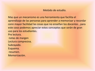 El documento presenta diferentes métodos y técnicas de estudio como la pre-lectura, subrayado, esquemas, resúmenes y mapas conceptuales. También recomienda estudiar en lugares tranquilos y planificar el tiempo dedicado al estudio evitando comer, viajar o estudiar cuando se tenga sueño. Finalmente, explica técnicas como el subrayado para resaltar ideas claves, los mentefactos para representar conocimientos de forma gráfica y la importancia de generar resúmenes y mapas conceptuales con una jerarquía y orden