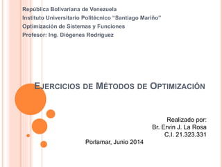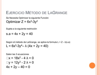 Este documento contiene varios ejercicios de optimización utilizando diferentes métodos como Lagrange, matriz jacobiana y condiciones de Kuhn Tucker. El primer ejercicio busca maximizar una función sujeta a una restricción usando el método de Lagrange. Otro ejercicio calcula el determinante jacobiano de una función. Finalmente, se describen las condiciones de primer orden de Kuhn Tucker para minimizar una función.