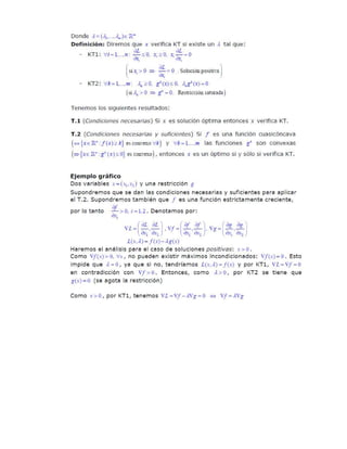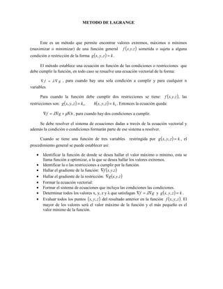 Este documento explica el método de Lagrange para encontrar valores extremos de una función sujeto a restricciones. Explica que el método establece una ecuación vectorial que relaciona el gradiente de la función con el de la restricción y λ. También presenta un ejemplo de aplicar el método para encontrar los valores máximos y mínimos de una función sobre un círculo. Luego introduce la matriz jacobiana y las condiciones de Kuhn-Tucker antes de concluir con extremos no restringidos de funciones de dos variables.