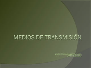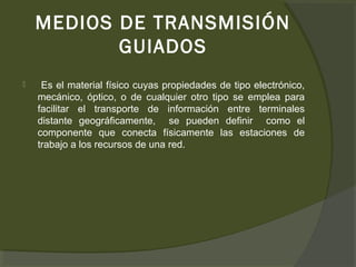 Este documento describe diferentes medios de transmisión guiados y no guiados. Entre los guiados se encuentran el cable coaxial, la fibra óptica y el par trenzado. La fibra óptica ofrece un ancho de banda mayor y menor atenuación de la señal, mientras que el cable coaxial tiene una atenuación más rápida. Los no guiados incluyen la radiotransmisión, que depende del campo magnético inducido, y la transmisión por microondas, que usa microondas como medio de transmisión inalámbrico.