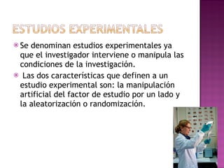 Los estudios experimentales son investigaciones en las que el investigador manipula y controla deliberadamente las condiciones del estudio para probar hipótesis. Estos estudios asignan aleatoriamente a los participantes a grupos experimentales y de control para evaluar la eficacia de terapias y actividades preventivas mediante la comparación de resultados entre los grupos. Los ensayos clínicos son el tipo más común de estudio experimental, en el que los participantes reciben diferentes tratamientos o placebos en condiciones controladas.