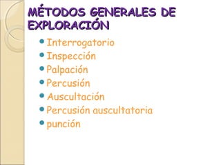 Este documento describe los principales métodos generales de exploración clínica, incluyendo el interrogatorio, inspección, palpación, percusión, auscultación y punción exploratoria. Explica cada método en detalle, cubriendo aspectos como su definición, técnica, reglas y datos que proporciona. El objetivo es orientar sobre las diferentes formas de examinar al paciente para diagnosticar problemas médicos.