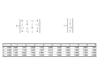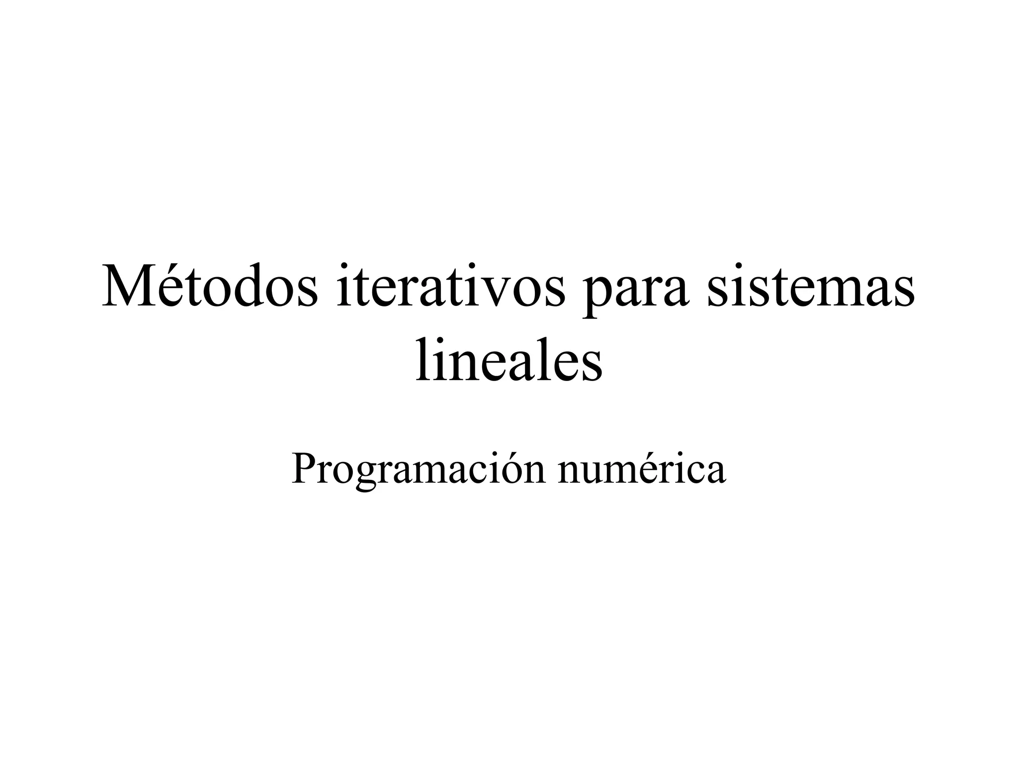 Este documento presenta los métodos iterativos para resolver sistemas de ecuaciones lineales. Introduce conceptos como normas vectoriales y matriciales, y métodos iterativos como Jacobi y Gauss-Seidel. Explica cómo implementar estos métodos numéricamente en software como MATLAB para aproximar la solución de sistemas.