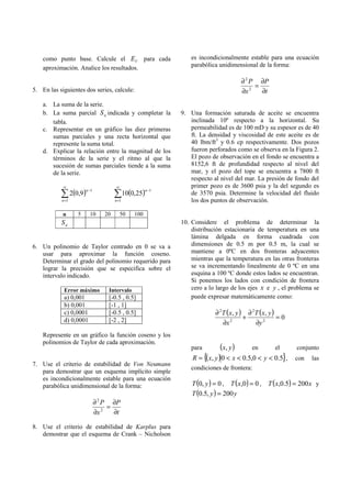 Este documento presenta varios problemas de ingeniería de petróleos y métodos numéricos para resolverlos. El primer problema involucra modelar numéricamente el almacenamiento y flujo de un líquido en un tanque. El segundo problema implica resolver analíticamente y numéricamente una ecuación diferencial del movimiento amortiguado. El documento también cubre temas como series de Taylor, esquemas numéricos, ecuaciones diferenciales parciales y flujo en medios porosos.