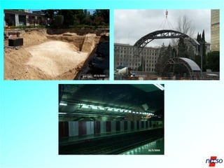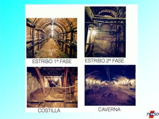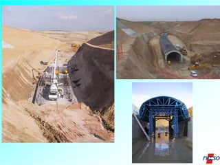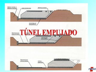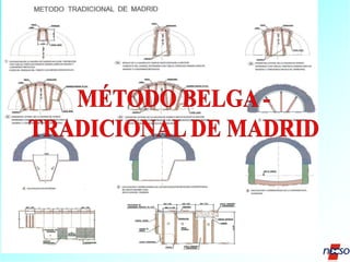 El documento detalla las fases del proyecto de construcción de túneles en la línea 8 del metro de Madrid, incluyendo la excavación, hormigonado e inyección en diferentes etapas. Se indica que el avance medio con tuneladora es de 350-550 metros por mes, comparado con 60 metros al mes usando métodos tradicionales. También se explican las estaciones y el presupuesto asignado para las diferentes partes del proyecto.