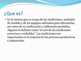El documento trata sobre la metrología. Explica que la metrología es la ciencia de las mediciones y las unidades de medida. Describe que la metrología es importante en procesos industriales y de producción para garantizar medidas precisas. Además, explica que existen diferentes campos de la metrología como la legal, industrial y científica. Finalmente, define conceptos clave relacionados con las mediciones y unidades de medida como sistema internacional de unidades, incertidumbre de medida y trazabilidad metrológica.