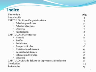 Este documento describe la situación actual de la distribución de personas en el sistema de metro de la Ciudad de México y propone un sistema para mejorar el flujo de usuarios. El metro se inauguró en 1969 y ahora cuenta con 11 líneas y 195 estaciones. Algunas líneas como la 1, 2, 3 y B están saturadas, transportando más del 30% de su capacidad. El documento analiza la historia, tarifas, accidentes, parque vehicular y capacidad del metro, y propone un sistema móvil que muestre el flujo de trenes y la ocupación de
