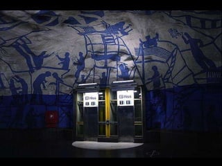 El metro de Estocolmo tiene aproximadamente 110 km de vías y 100 estaciones, muchas de las cuales están decoradas con obras de arte integradas en la arquitectura. Las estaciones utilizan a menudo la roca natural como parte de sus decoraciones mediante frescos, esculturas, metales e incrustaciones. La estación de Rissne cuenta con un fresco que narra la historia de la vida en la Tierra. El metro de Estocolmo abrió su primera línea en 1950 e incorporó el arte en todas sus estaciones, con obras de casi 150 artistas.