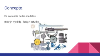 La metrología es la ciencia de las medidas. Se utiliza para medir diferentes magnitudes físicas como longitud, temperatura, masa y tiempo, usando instrumentos de medición precisos. Existen diversos instrumentos para medir estas cantidades físicas como el metro, termómetro, balanza, reloj y otros. La metrología está relacionada con la tecnología ya que los aparatos modernos se crean con base en los conocimientos de medidas.