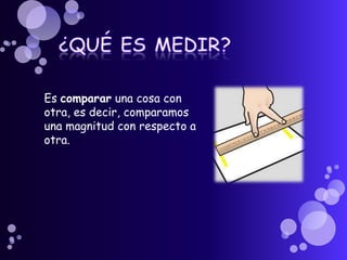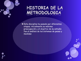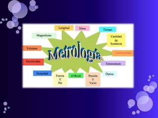 Este documento trata sobre la metrología, que es la ciencia que estudia los sistemas de pesos y medidas y determina las magnitudes físicas. Explica los diferentes tipos de patrones usados en la metrología legal, científica e industrial. También describe las características de un medidor de distancias láser que incluyen una pantalla LCD, punto láser, disparador automático y capacidad de medir distancias entre 0,05 y 200 metros.