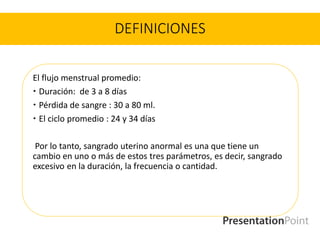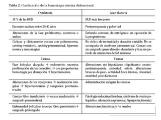 Este documento define las metrorragias y otros tipos de sangrado uterino anormal, describe la fisiopatología del endometrio, y explica los métodos de diagnóstico y tratamiento de las metrorragias. Define las metrorragias como sangrado uterino que ocurre durante el período menstrual y dura más de 7 días o excede los 80 ml. Explica que la mayor parte de la sangre menstrual proviene de las arteriolas espirales del endometrio. Los métodos de diagnóstico incluyen la biopsia endometrial y la