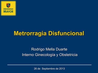 La metrorragia disfuncional es el principal motivo de consulta ginecológica en mujeres en edad fértil, relacionada con trastornos del ciclo menstrual y causas anovulatorias. El diagnóstico se basa en la historia clínica y examen físico, mientras que el tratamiento incluye terapia hormonal y opciones no hormonales para regular los niveles hormonales y controlar el sangrado. En casos severos, la histerectomía o la ablación endometrial son alternativas quirúrgicas a considerar.