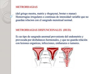 Las metrorragias son hemorragias uterinas anormales que no guardan relación con el sangrado menstrual normal. Pueden ser disfuncionales, es decir, provocadas por desbalances hormonales sin lesiones orgánicas, o anovulatorias e ovulatorias. Su tratamiento incluye controlar el sangrado mediante hemostasia y tratamiento hormonal, prevenir recidivas y corregir anemia.