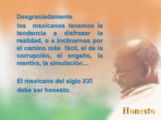 Este documento propone un experimento para iniciar un cambio de conciencia en México. Busca que los mexicanos trabajen en equipo y unan sus capacidades para crear un México más grande, poderoso y próspero. Propone características como evitar la desidia, ser responsables en todos los aspectos de la vida, ejercer responsabilidad social, ser ecologistas y ahorrativos. El experimento comenzó en una universidad en 2002 y su objetivo es que cada persona comparta el mensaje con al menos 20 mexicanos más.