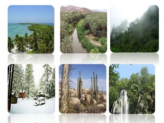México se ubica en América del Norte, limita al norte con Estados Unidos y al sureste con Guatemala, y es el único país con dos golfos en dos océanos. El país tiene una gran diversidad climática desde climas fríos de montaña hasta cálidos en la costa. La gastronomía mexicana se basa en ingredientes nativos como el maíz, chile y frijoles y incluye platos populares como tacos, enchiladas y ceviches. Algunas de las principales zonas turísticas de México son Cancún, Jal