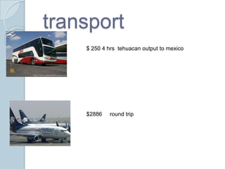 El documento lista lugares turísticos en la Ciudad de México como Reforma Avenue, el Palacio Nacional, Six Flags, el Parque Nacional Ajusco, la Catedral Metropolitana y Teotihuacán. También incluye información sobre el clima actual en la Ciudad de México, con una temperatura de 19°C, viento del sureste a 16 km/h y 35% de humedad.