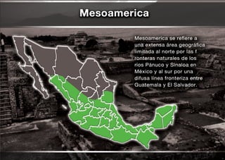 Este documento describe las principales culturas que se desarrollaron en Mesoamérica, incluidas las culturas Olmeca, Zapoteca, Maya, Teotihuacana, Tolteca y Azteca. Resalta características comunes como la agricultura, la vida urbana y la complejidad social, política y religiosa de estas civilizaciones prehispánicas. También aborda brevemente el proceso de colonización española y el establecimiento del Virreinato de la Nueva España.