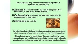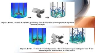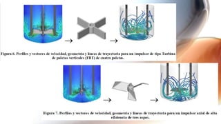 Este documento describe diferentes tipos de agitadores y mezcladores para una variedad de fluidos y materiales. Explica que los agitadores radiales crean dos regiones separadas de agitación que no favorecen la mezcla, mientras que los agitadores axiales distribuyen las líneas de trayectoria a lo largo de toda la altura del tanque para lograr una mezcla más homogénea. También cubre conceptos como el número de Froude, estimaciones de potencia requerida y variables clave para el diseño de sistemas de agitación y mez