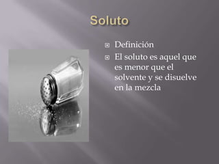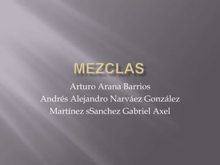 Este documento proporciona información sobre diferentes tipos de mezclas y métodos de separación de mezclas. Define mezclas homogéneas y heterogéneas, y describe brevemente métodos de separación como la sedimentación, filtración, evaporación, destilación y cristalización.