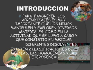 Este documento presenta un plan de lecciones de dos días para niños preescolares sobre mezclas. La lección introducirá los conceptos de mezclas homogéneas y heterogéneas y tendrá a los niños observando cómo se mezclan diferentes sustancias en agua fría y caliente. La evaluación consistirá en una lista de verificación para verificar que los niños puedan experimentar de manera segura con diferentes materiales.