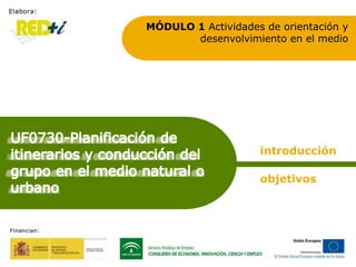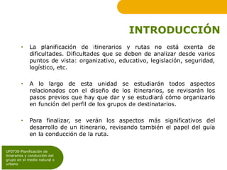 Este módulo trata sobre la planificación de itinerarios y rutas, incluyendo cómo analizar las dificultades desde varios puntos de vista como la organización, educación, seguridad y logística. Explica los pasos previos para diseñar itinerarios teniendo en cuenta el perfil de los grupos, y los aspectos clave para el desarrollo de la ruta y el papel del guía. Los objetivos son analizar los recursos disponibles del entorno, comprender los recursos para actividades medioambientales, y ser capaz de planificar e implement